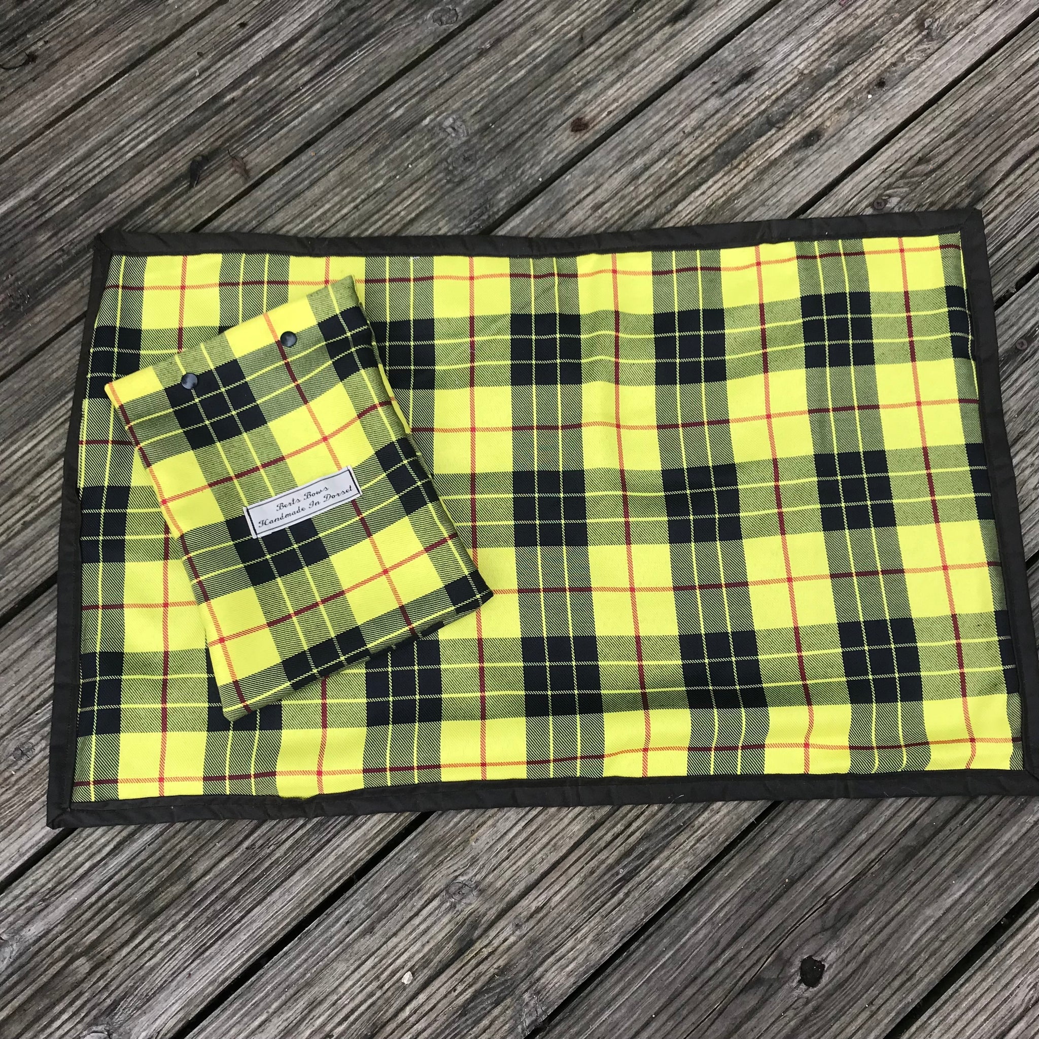 Kinross Tartan Sit Mat with waterproof wax backing and wadding lining.