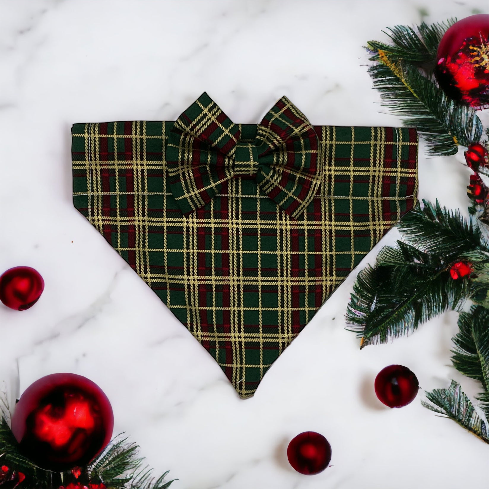 Introducing the delightful Christmas Green check Dog Bow and Bandana.