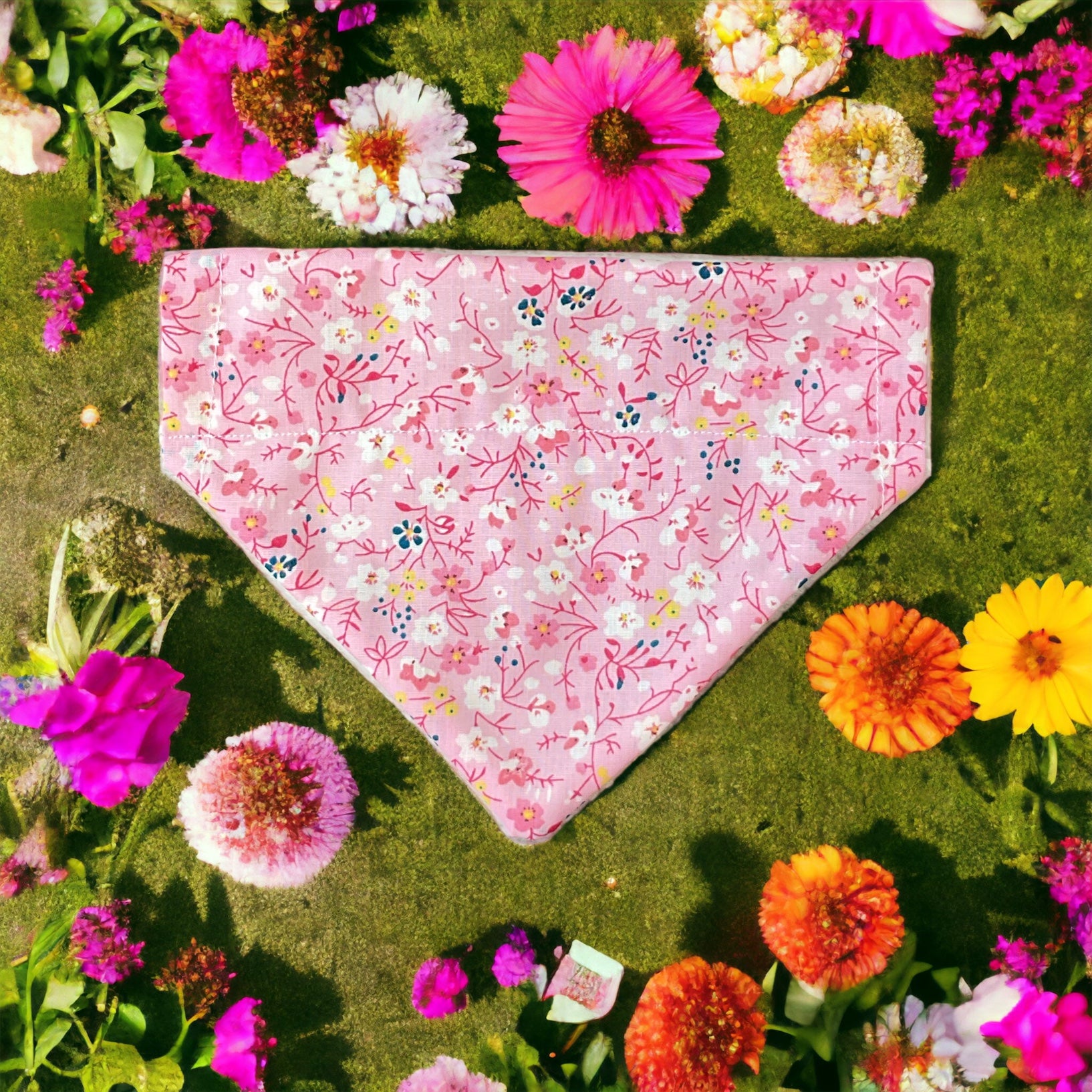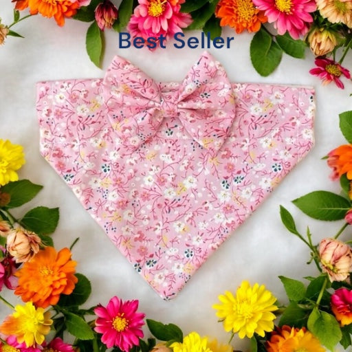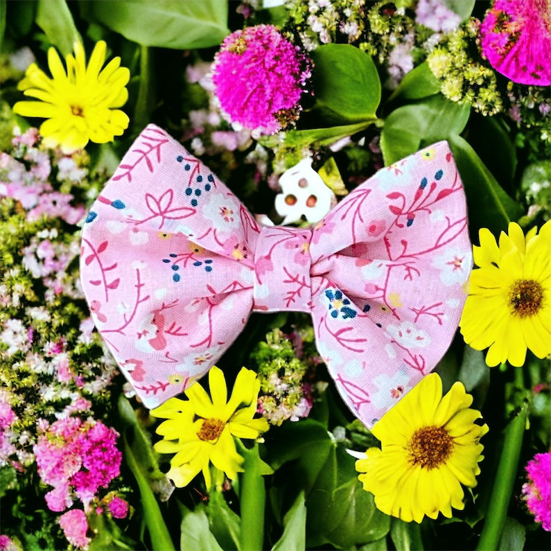 This dainty bow and bandana is a burst of colour and elegance, designed with a pink base and adorned with petite flowers, it exudes a delicate and feminine aura.